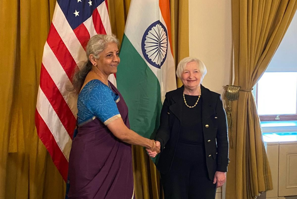 Finance Minister Nirmala Sitharaman with U.S. Treasury Secretary Janet Yellen in Washington D.C. | Photo Credit: Sriram Lakshman Finance Minister Nirmala Sitharaman held bilateral talks with her