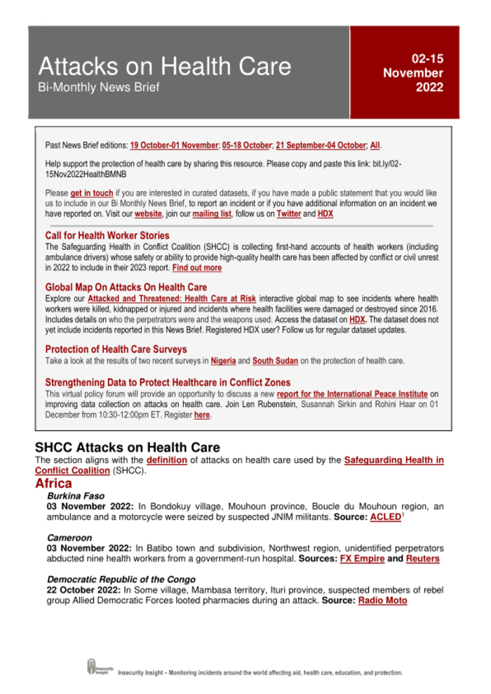 Attacks on Health Care Bi-Monthly News Brief: 02 – 15 November 2022 – World – ReliefWeb