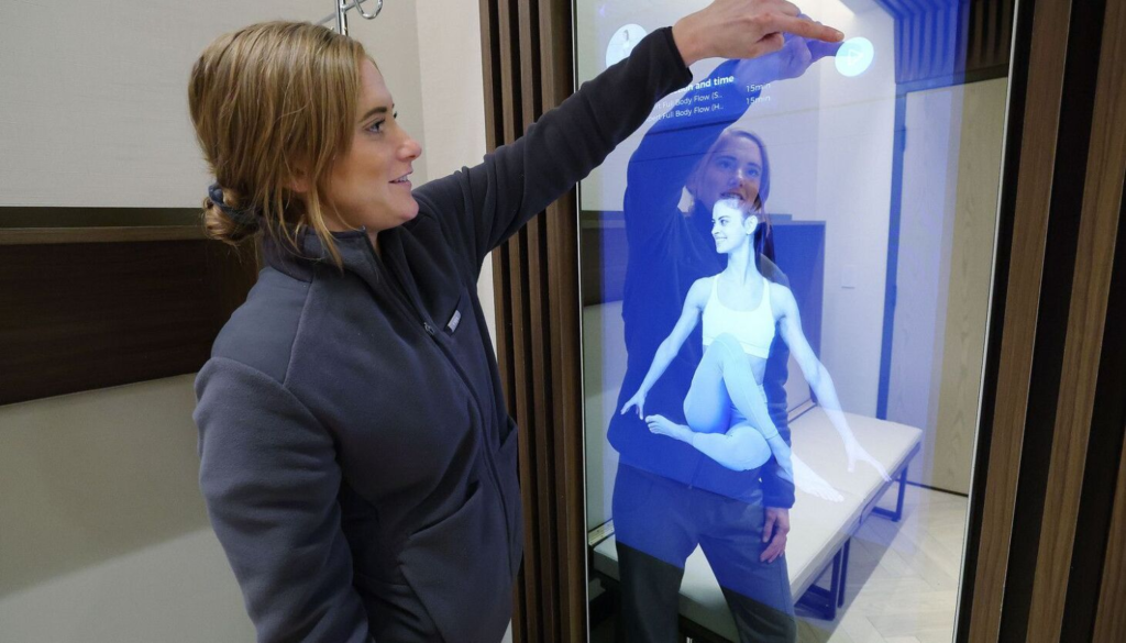 Treat medical assistant Katy Vasquez looks over the yoga option for passengers to use at the upscale health and wellness center now open at the Salt Lake