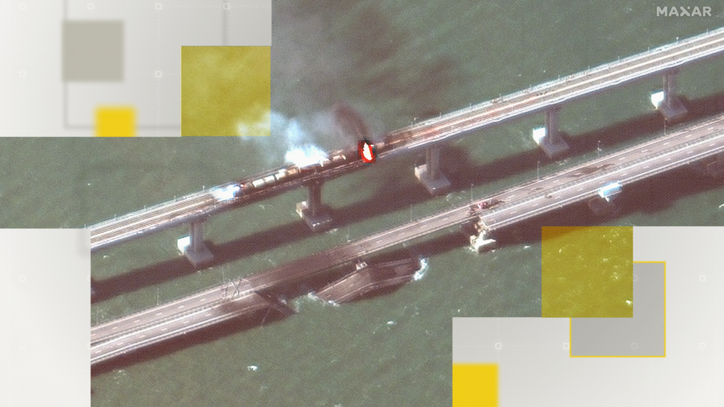 The damage to a key bridge between Russia and Crimea is visible from space. The Kremlin has accused Ukraine of “terrorist action” and says it has carried